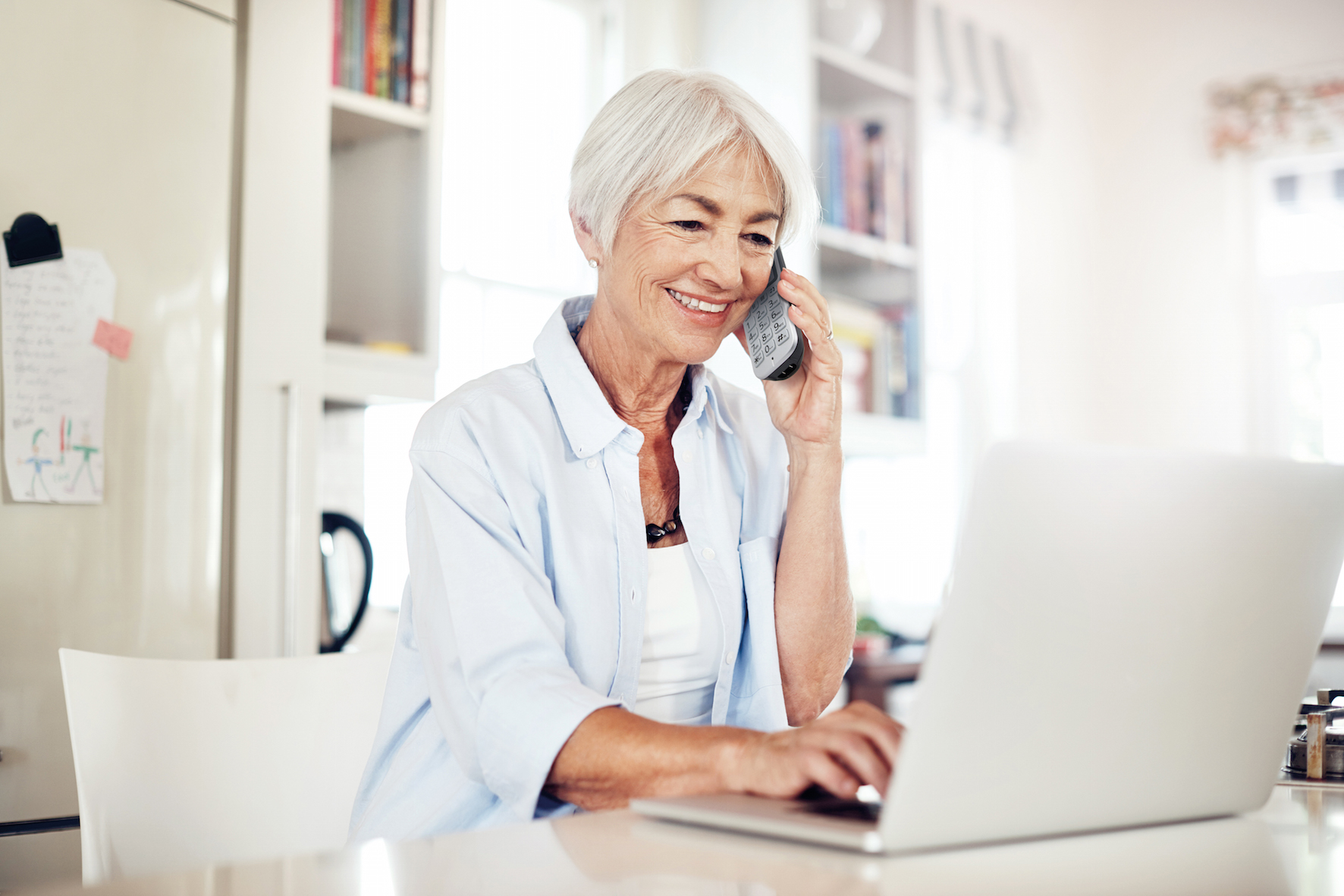 Cropped shot of a senior woman talking on a cellphone while using a laptop at home